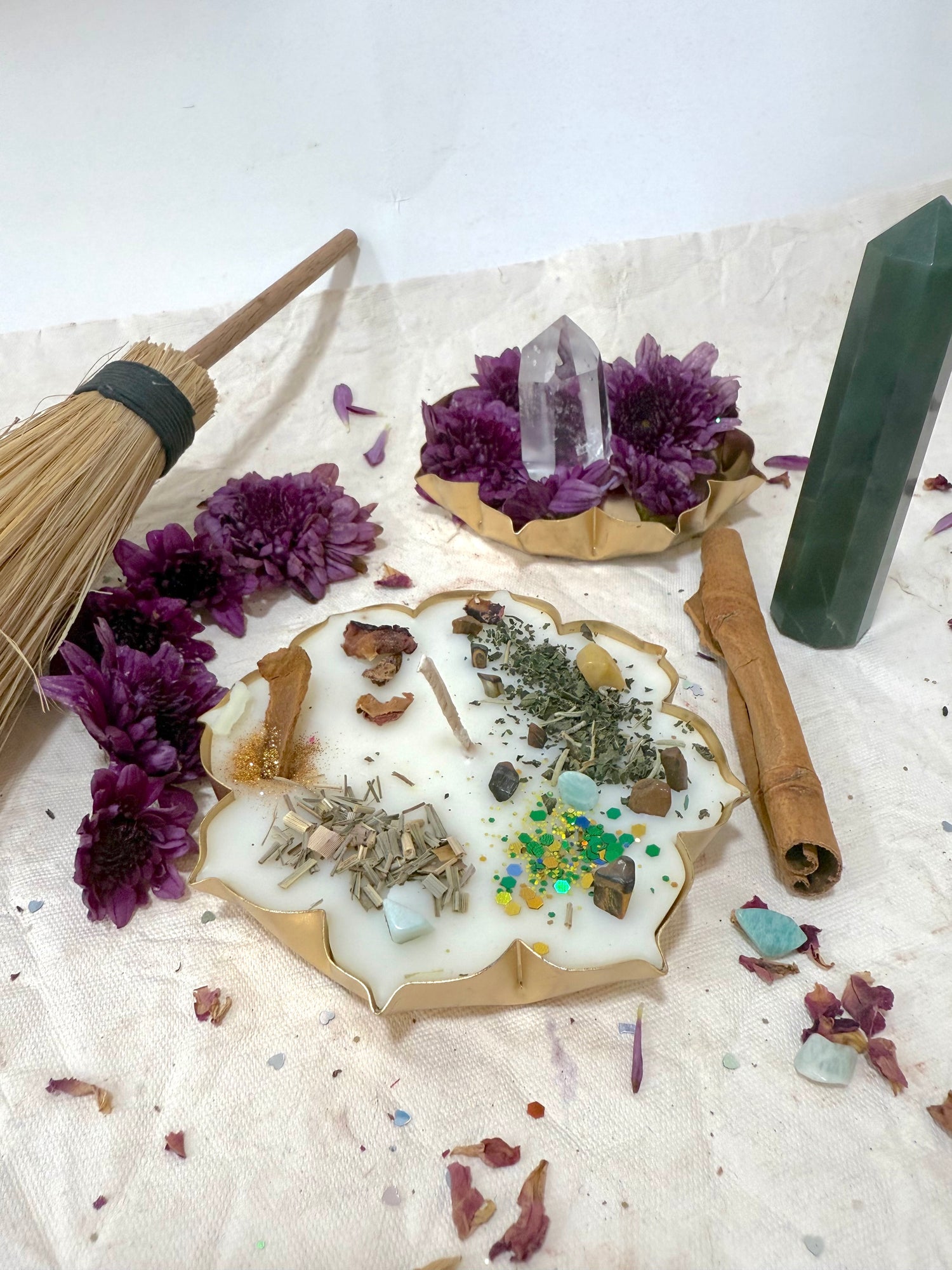 Teracotta diyas, each handpoured with vegan wax, topped with rose petals & crystals, which will help for harnessing the energies of love & prosperity.